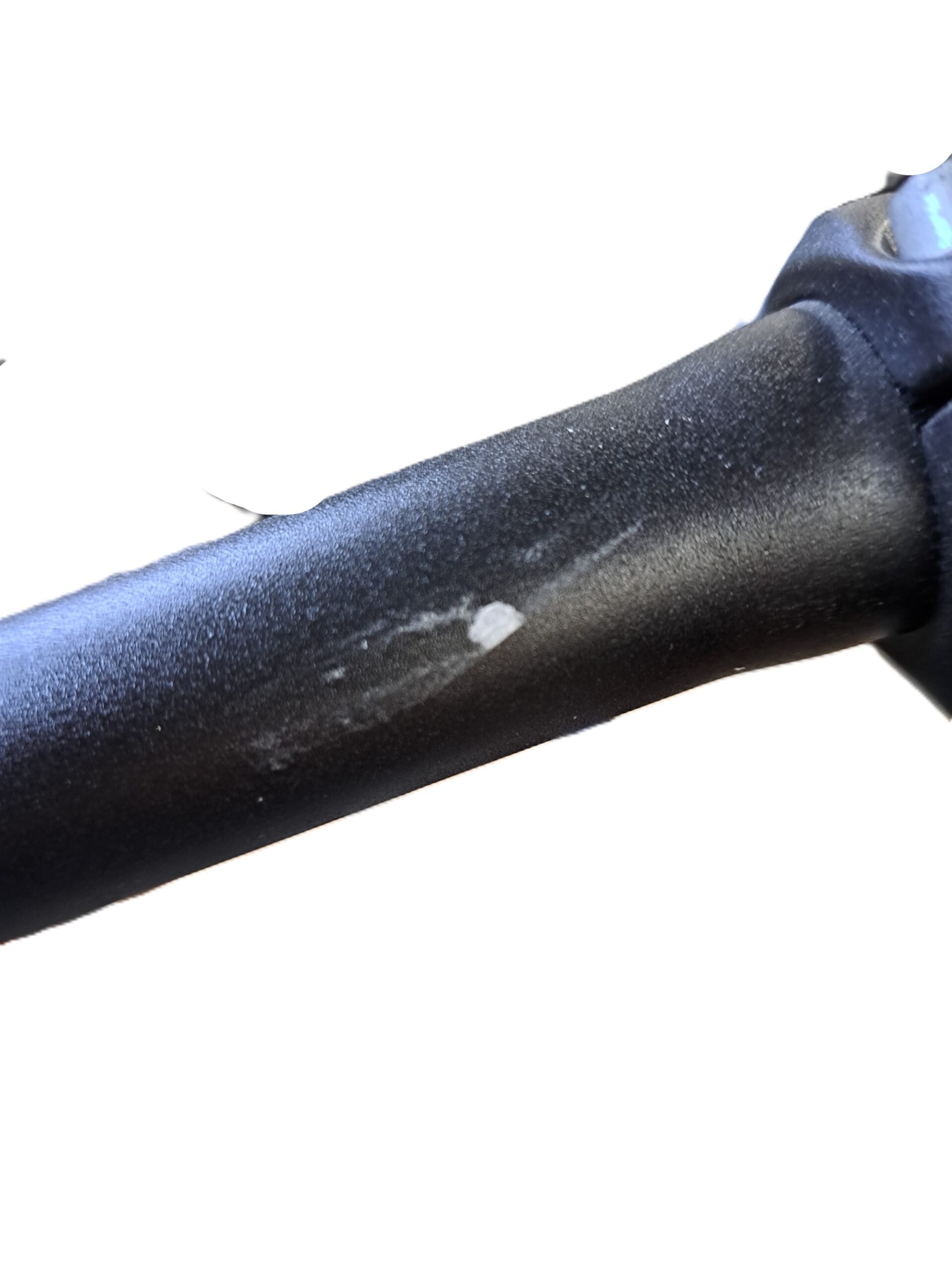 Conditie van de fiets: oppervlakkige slijtage en lichte krassen op de bovenbuis en vork, fietsstandaard en stuur hebben zichtbare krassen